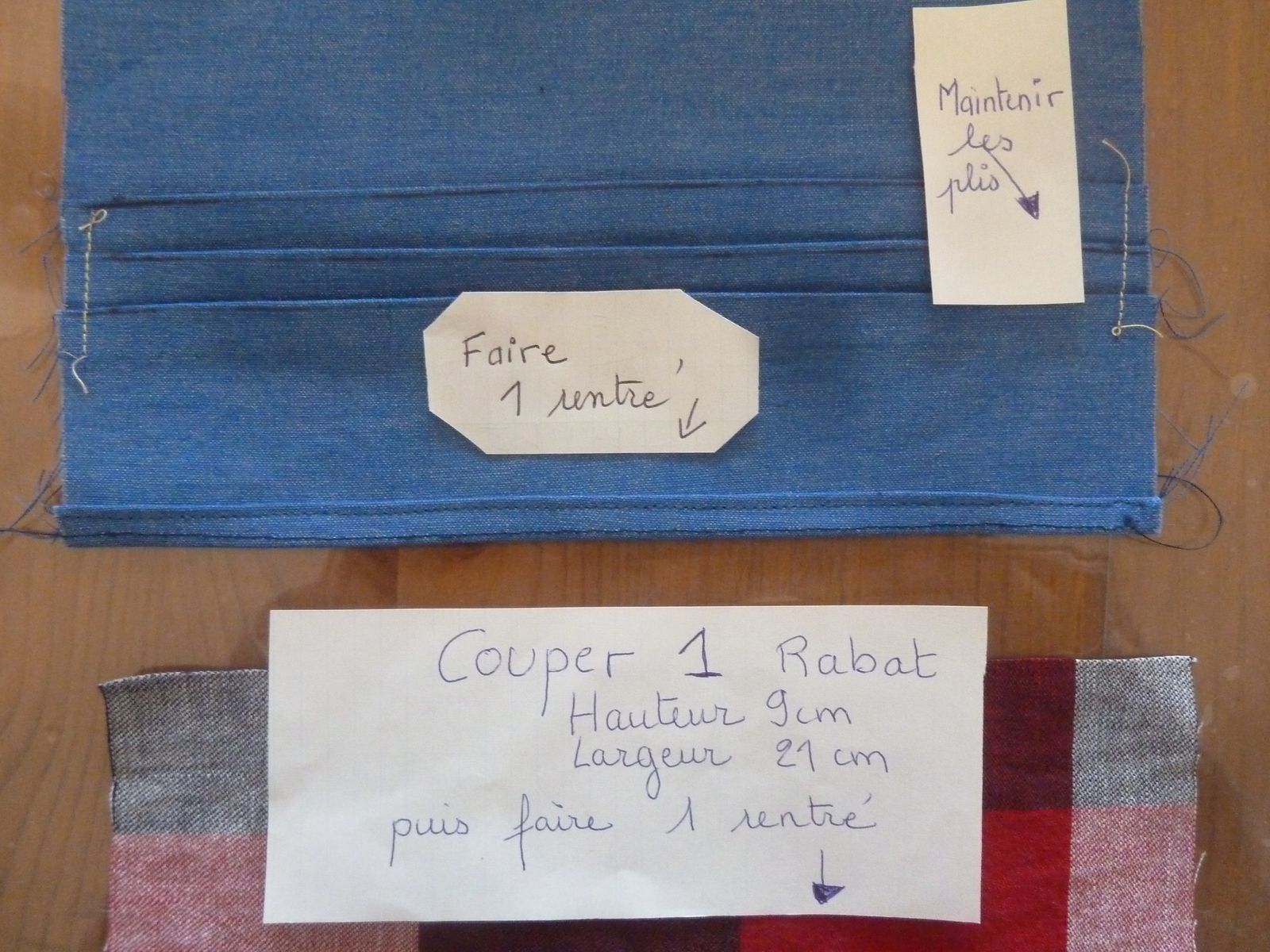 Couper 1 morceau de 9 cm de haut et 21 cm de côté = le rabat , faire 1 seul rentré (ourlet) sur la longueur.