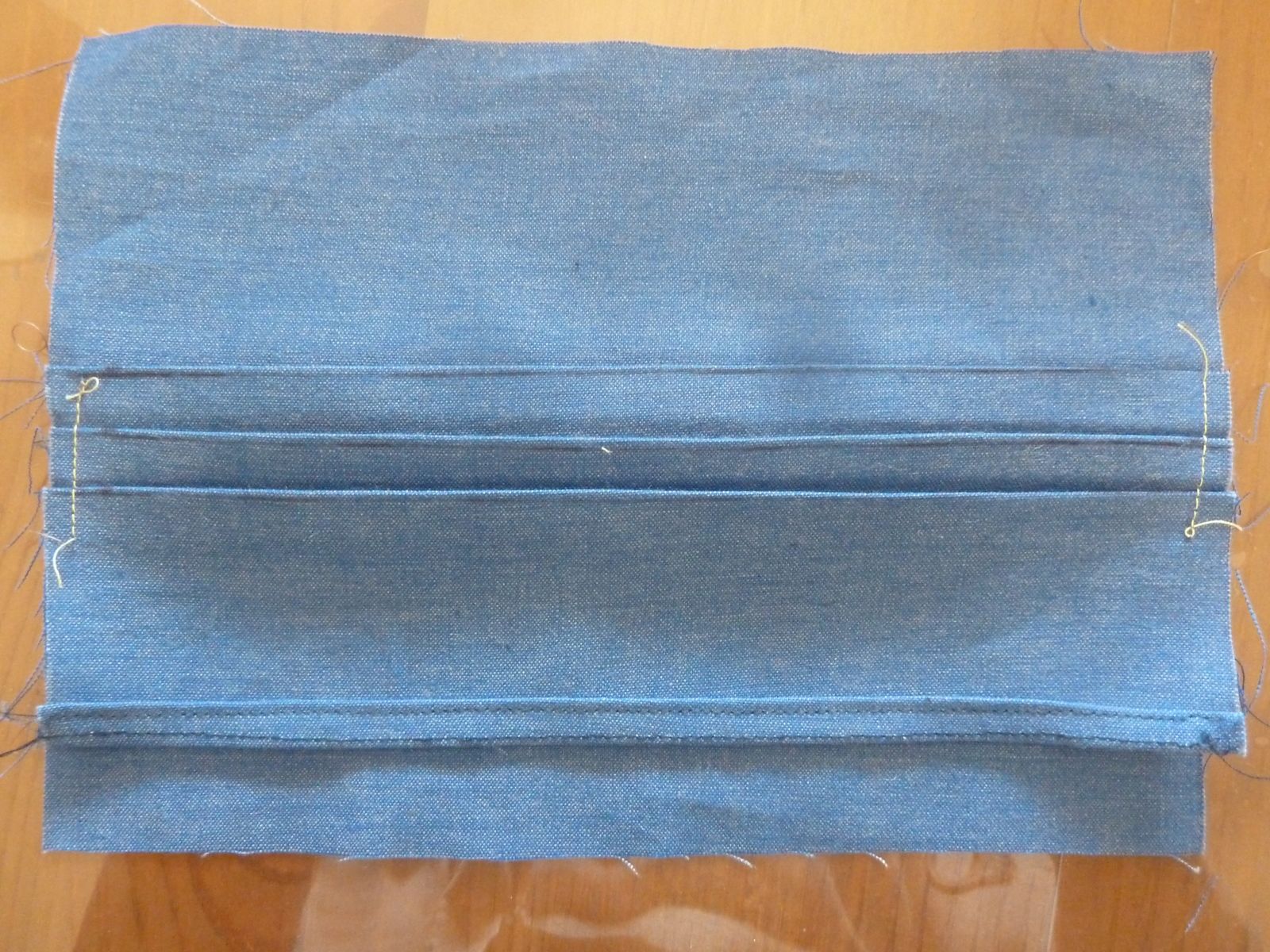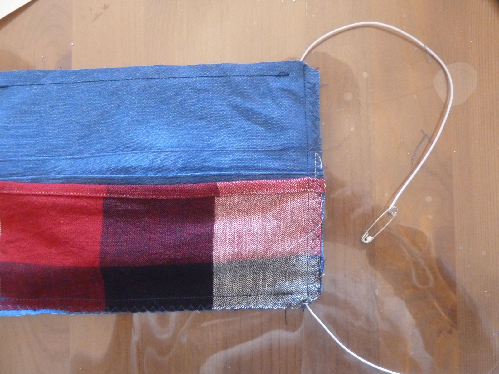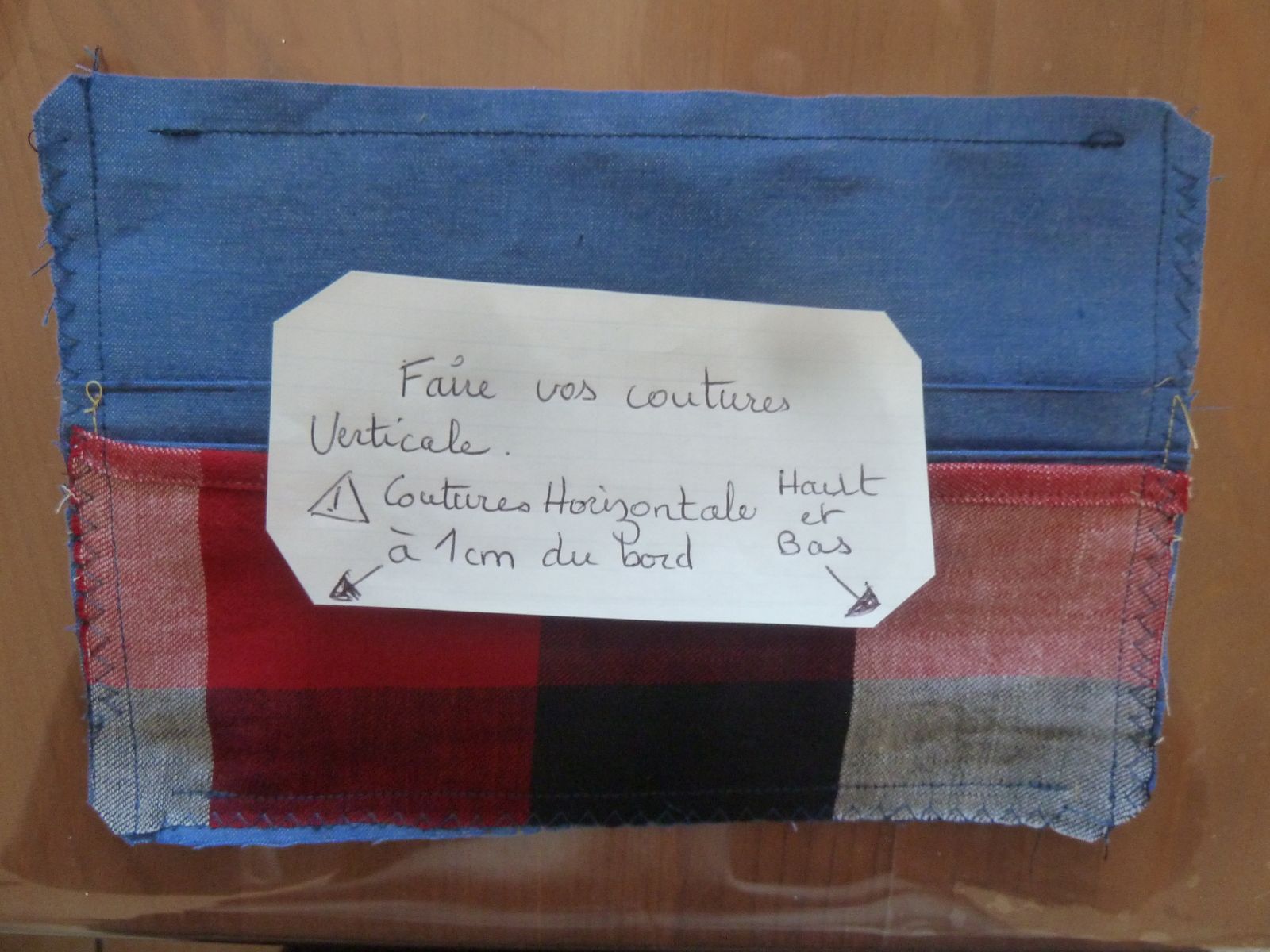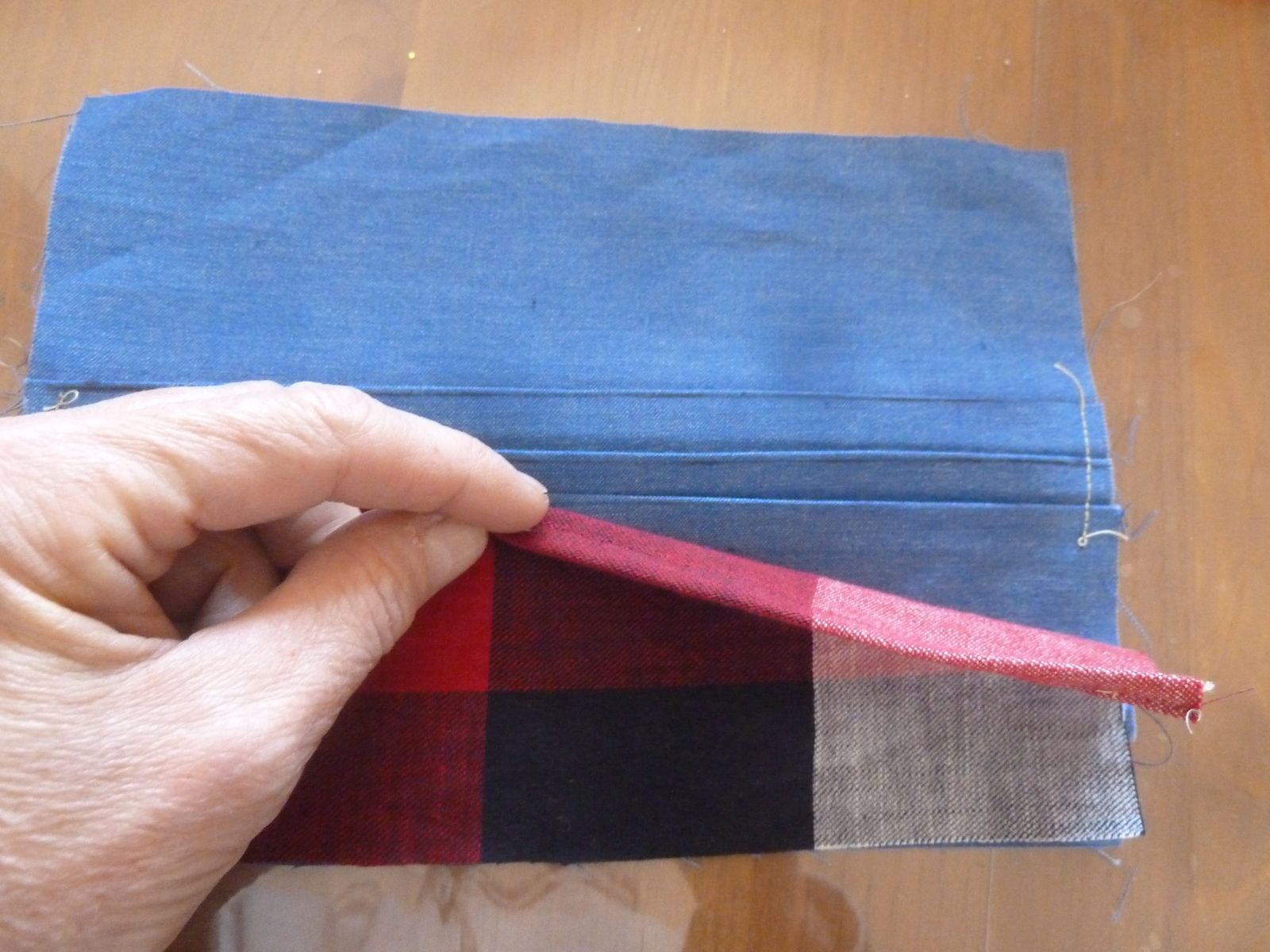Assemblage : Épingler les 2 morceaux endroit contre endroit + le rabat (ourlet vers le haut)